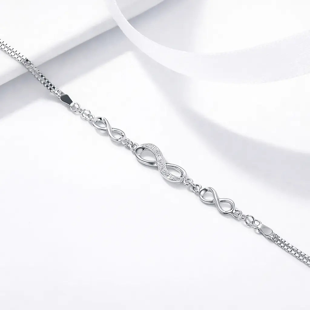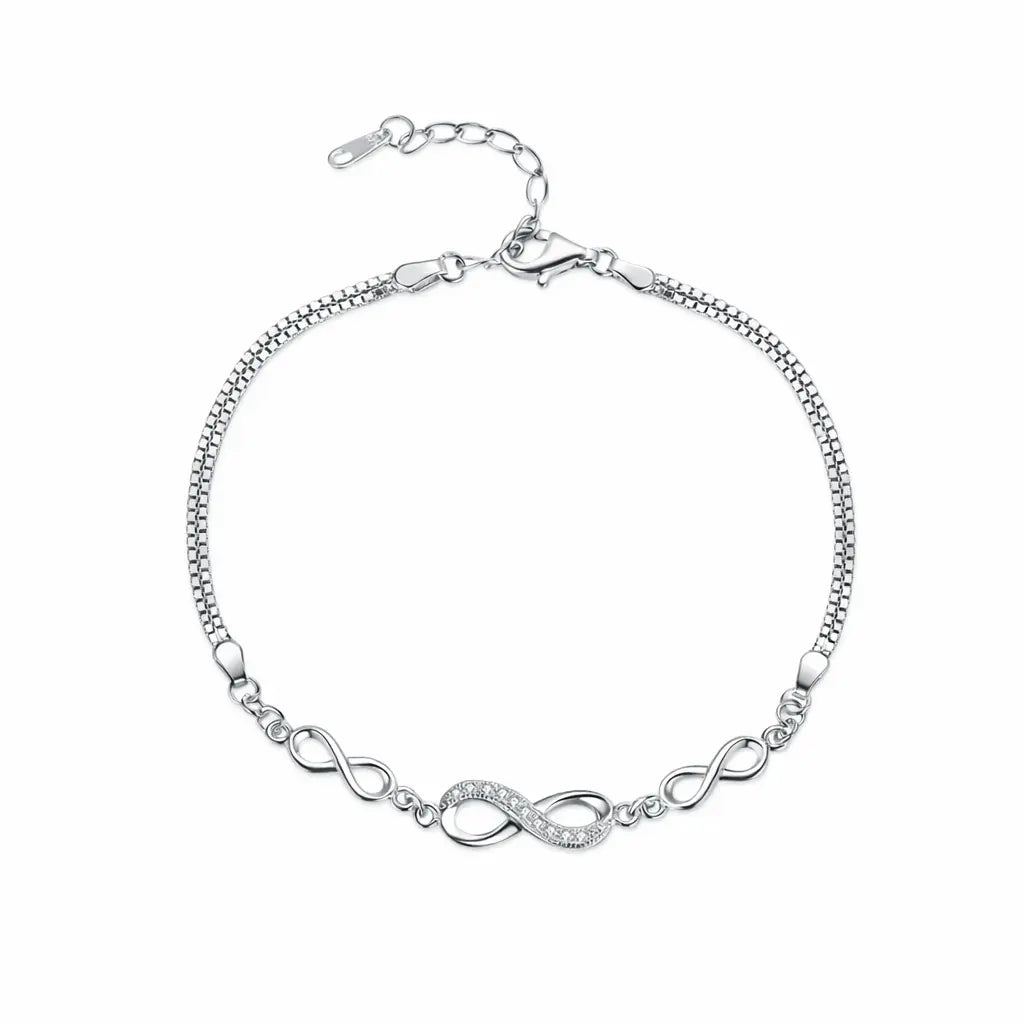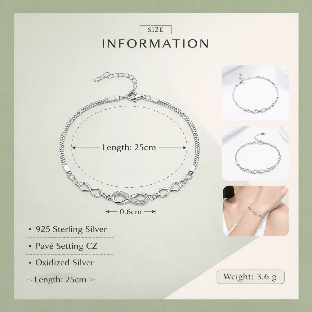 The Infinity Love Bracelet is built on genuine 925 sterling silver — a platinum-plated chain, 25 cm adjustable, sitting against the wrist with a clean, bright finish that platinum gives and silver alone cannot. At the centre: an infinity charm, 2 cm wide, every surface of the ∞ set with pavé cubic zirconia. Not one stone. Not a single accent. The entire symbol — covered in light. At 3.6 g it rests comfortably all day. The ∞ symbol means what it has always meant: no end. Worn as a personal reminder or given to someone who needs to hear it.