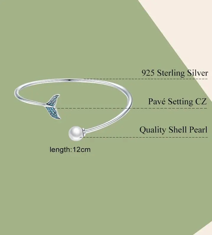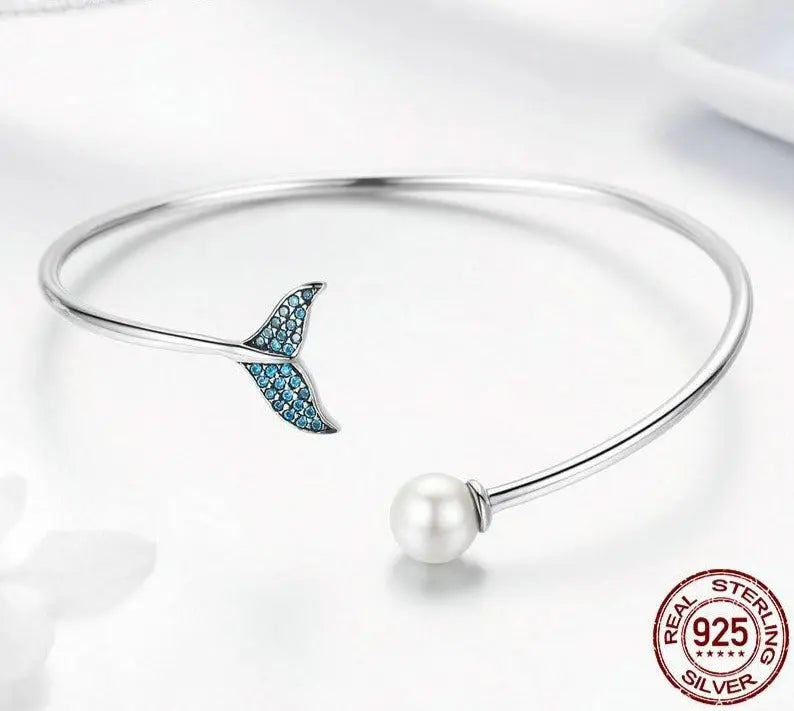Let your style dive into elegance with this 925 sterling silver mermaid tail bracelet. Featuring a shimmering blue zircon accent and a graceful open cuff design, this piece evokes the magic of the ocean—perfect for those drawn to fantasy, freedom, and feminine strength.