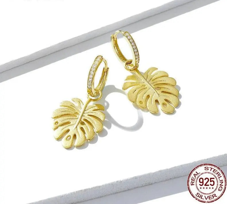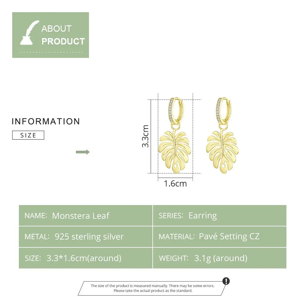 🌿 Golden Monstera Dream™ Drop Earrings – 925 Sterling Silver with Pavé CZ Accents