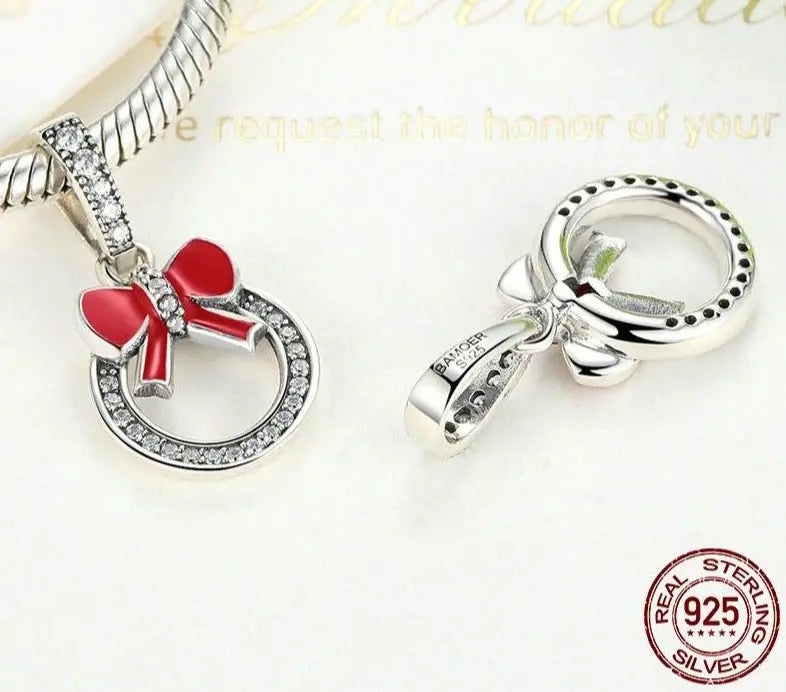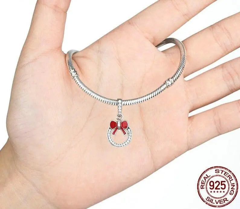 Step into the festive spirit with this beautifully crafted Red Bow Knot Wreath Charm. Shaped like a traditional Christmas wreath, this charm is designed to bring joy, nostalgia, and elegance to your holiday bracelet. The vibrant red enamel bow, paired with genuine 925 sterling silver detailing, adds a pop of cheerful color while honoring the deep symbolism of eternal love and holiday traditions.