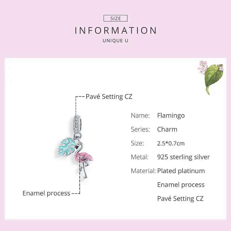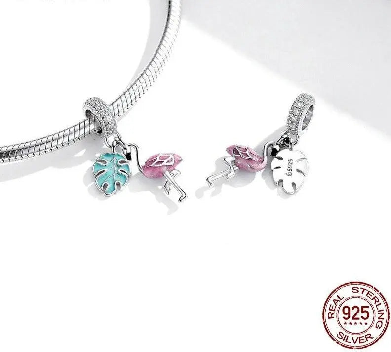 🌴 925 Sterling Silver Flamingo Charm – Tropical Pink Enamel Leaf Dangle Bead