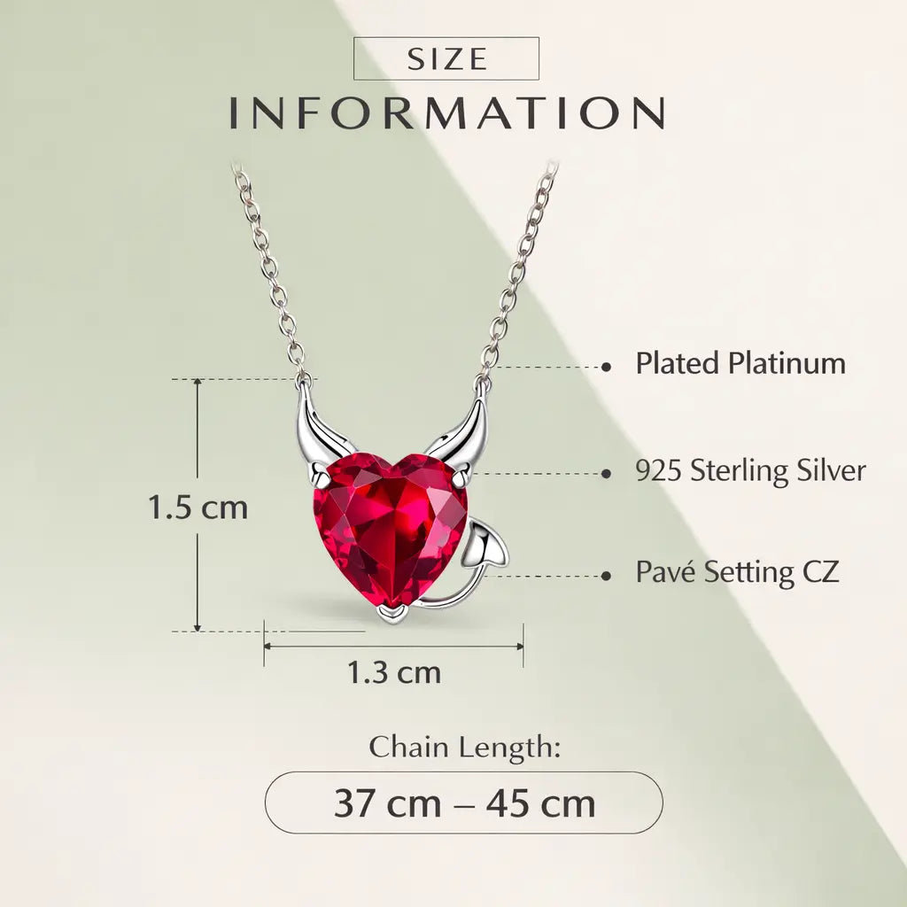 The Red Heart Devil Pendant Necklace is a deep red facet-cut cubic zirconia heart — set in genuine 925 sterling silver with platinum plating, fitted with silver devil horns and a small tail. The pendant measures 1.3 cm wide by 1.5 cm tall. The chain adjusts from 37 cm to 45 cm, resting precisely at the collarbone. The red CZ cuts light into facets. The horns and tail are pavé-set for additional sparkle. It is not a subtle piece — it is made for someone who has a point of view and wants jewelry that reflects it. Worn alone, it is a statement. The kind that starts conversations.